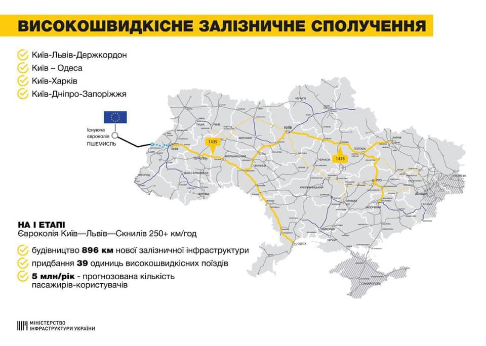 Владислав Криклий опубликовал карту, на которой видно, что через Хмельницкий будет курсировать высокоскоростной поезд, который будет ехать из столицы до границы с Польшей. Однако в Министерстве инфраструктуры пока не уточнили, будет ли делать поезд остановку в Хмельницком.