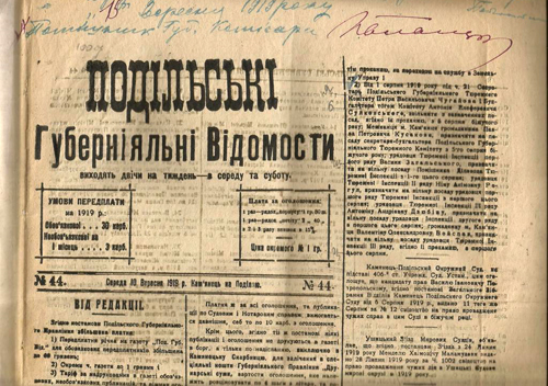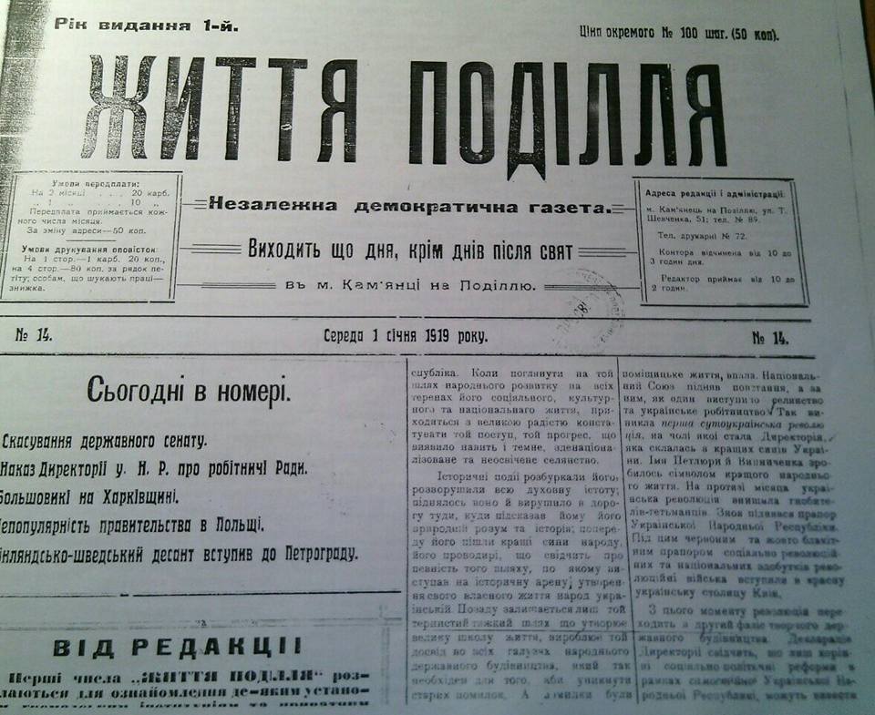 Газеты выпускали не только государственные органы, партии, общественные организации, но отдельные граждане. Кроме того, многие периодические издания из Киева и Галиции переносились в подольские городки. В частности, в Каменец-Подольской типографии Свято-Троицкого братства выходили “Голос Подольской церкви”, “Жизнь Подолья” – газета Подольского общества “Просвита”, “Подолье” – печатный орган Подольского губернского комиссариата, “Новый путь” и “Трудовой путь”, “Украинское слово” — ранее выходивший в Станиславе и Староконстантинове, журнал “Наш шлях”. В Новой Ушице действовала частная типография Н. Полячка. В Проскурове директор частной типографии Г. Баран выпускал газету “Земская мысль”. В Каменце-Подольском в течение 1919 года вышло 37 изданий.