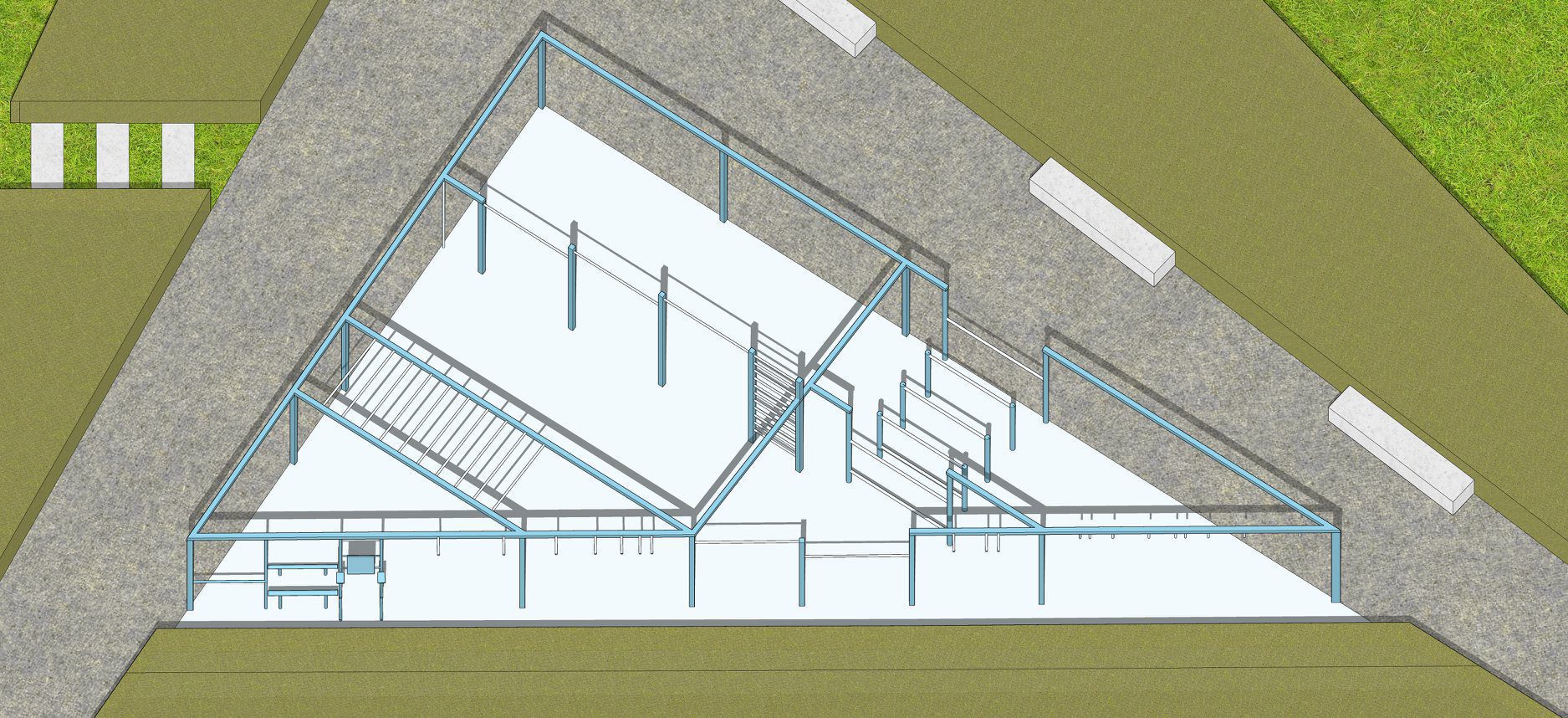 Архитекторы планируют разместить на небольшой территории спортивной площадки как можно большее количество тренажеров. Поэтому они предлагают вариант объединенных по периметру тренажеров. Это, в свою очередь, увеличивает количество возможных точек для занятия спортом. Основной акцент сделан на воркаут и потребностях для соответствующих упражнений. У площадки предлагают высадить кусты и деревья. Это будет создавать уютный уголок и давать тень. Покрытие спортивной площадки — прорезиненное сплошным методом.