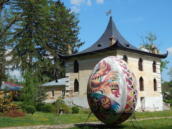 Поблизу палацу можна побачити величезну писанку, розписану самчиківським розписом. Її створили місцеві майстри. У 2012 р. на параді вишиванок у Києві вона представляла Хмельниччину.
